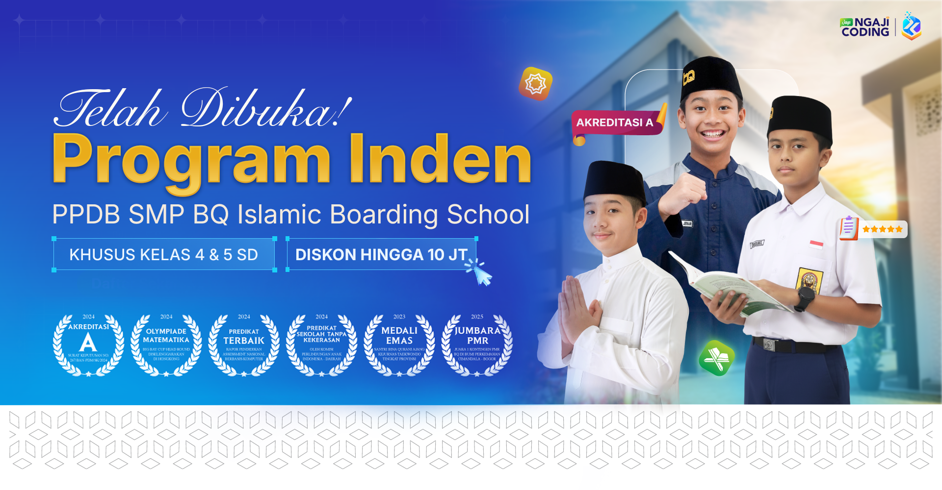 BQ Islamic Boarding School merupakan lembaga pendidikan formal berasrama jenjang SMP putera sederajat, yang telah Terakreditasi A berdasarkan surat keputusan no.267/BAN-PDM/SK/2024. Memiliki fasilitas terbaik untuk menunjang kenyamanan dan kesuksesan proses pembelajaran peserta didik.